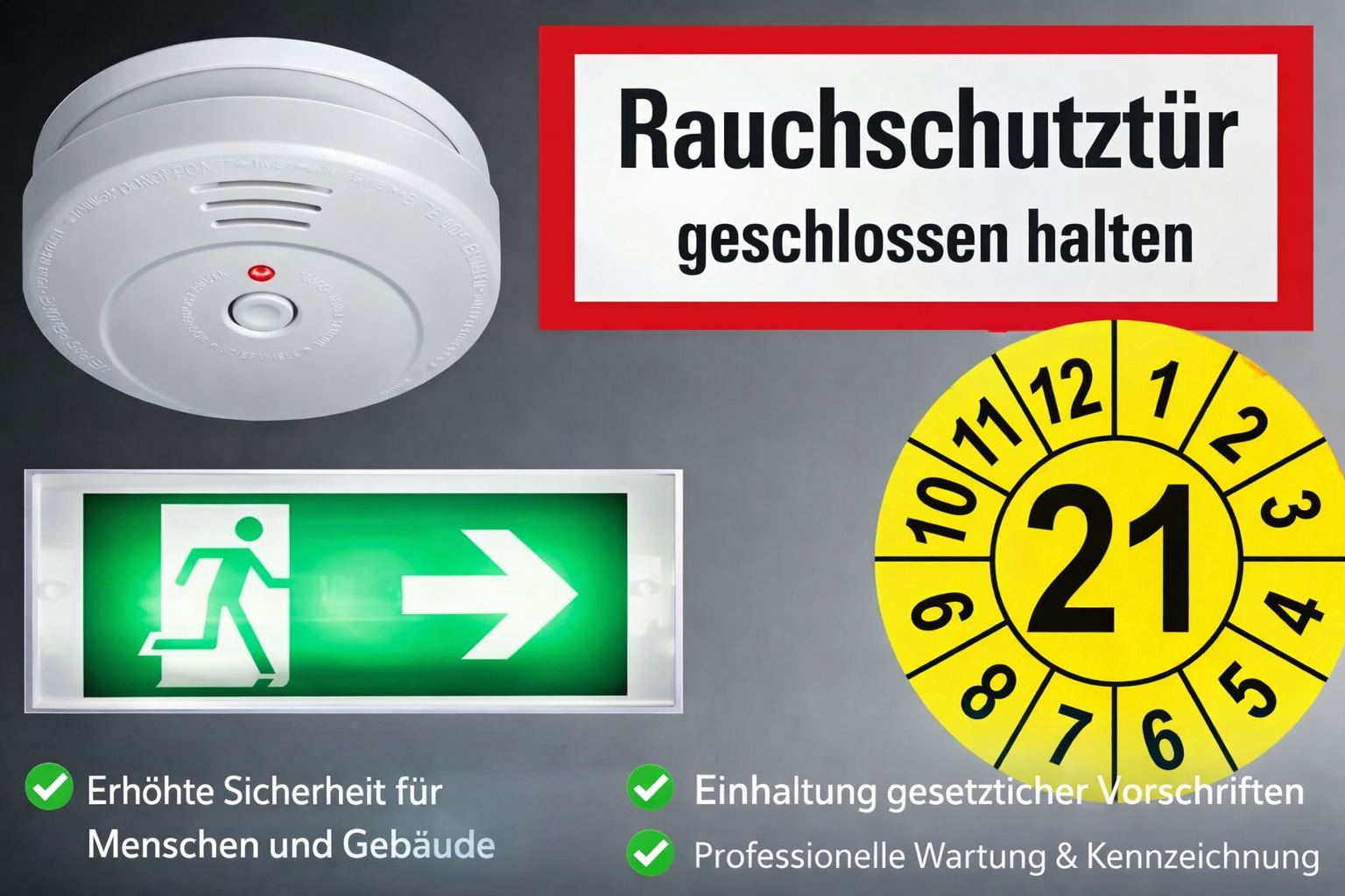 Wir prüfen nicht nur Ihre Feuerlöschgeräte. Gerne kümmern wir uns auch um die einwandfreie Funktion Ihrer Notbeleuchtungsanlagen, ihrer Brand- und Rauchschutztüren und Ihrer Rauch- und Wärmeabzugsanlage und Ihrer Rauchwarnmelder. Selbstverständlich erhalten Sie alle erforderlichen Prüfbescheinigungen und Prüfsiegel.